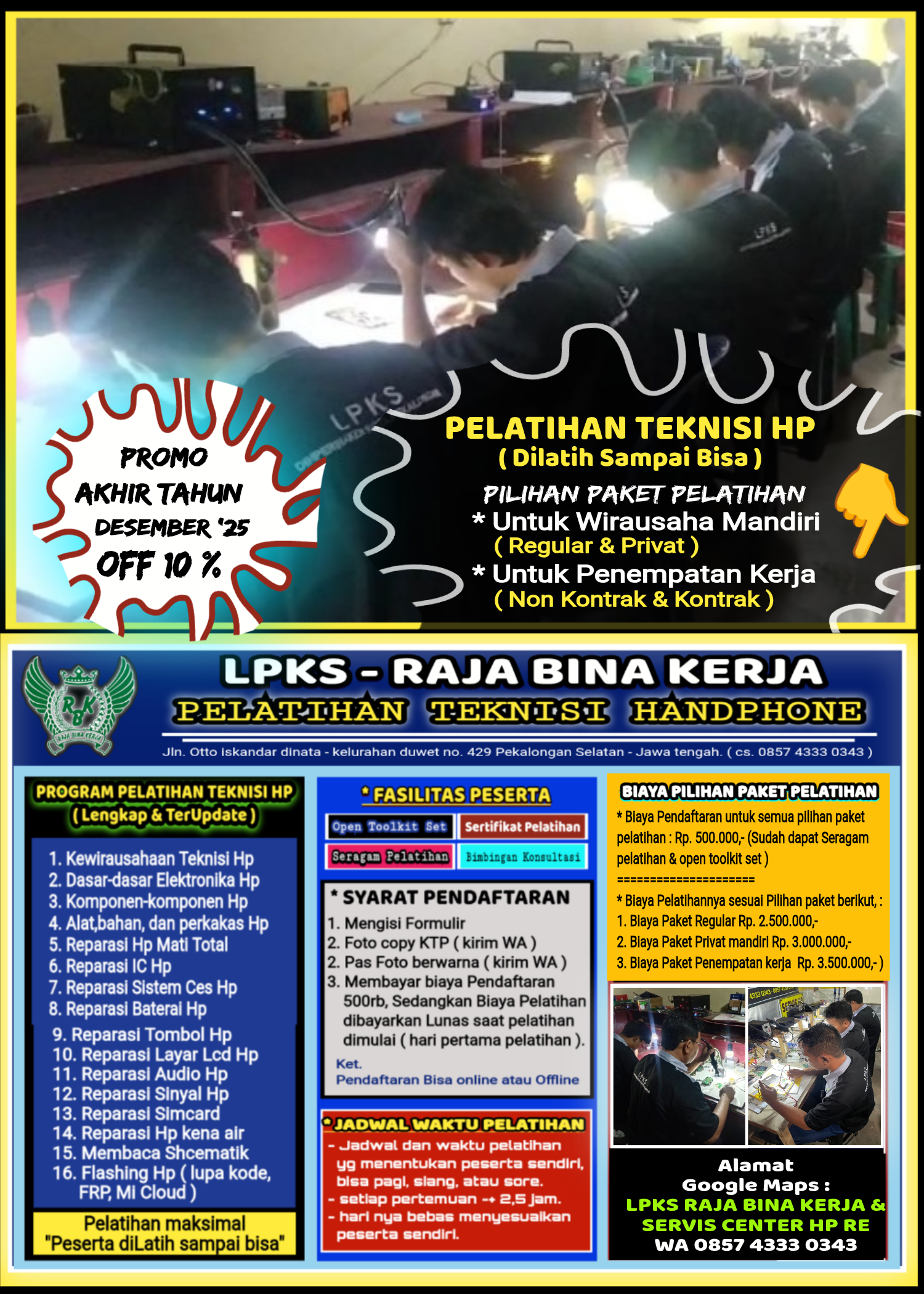 ( Pendaftaran 500.000 + Biaya Pelatihan 3.500.000 ( Pasca Pelatihan siswa langsung di tempatkan kerja di servis center Hp RE-Group ~ lebih dari 30 konter cabang yang kami siapkan untuk magang & penempatan kerja, 👉Paket ini cocok bagi peserta yang belum ada aktifitas kerja pokok atau bagi temen2 yg belum memiliki cukup modal untuk buka usaha konter mandiri ))